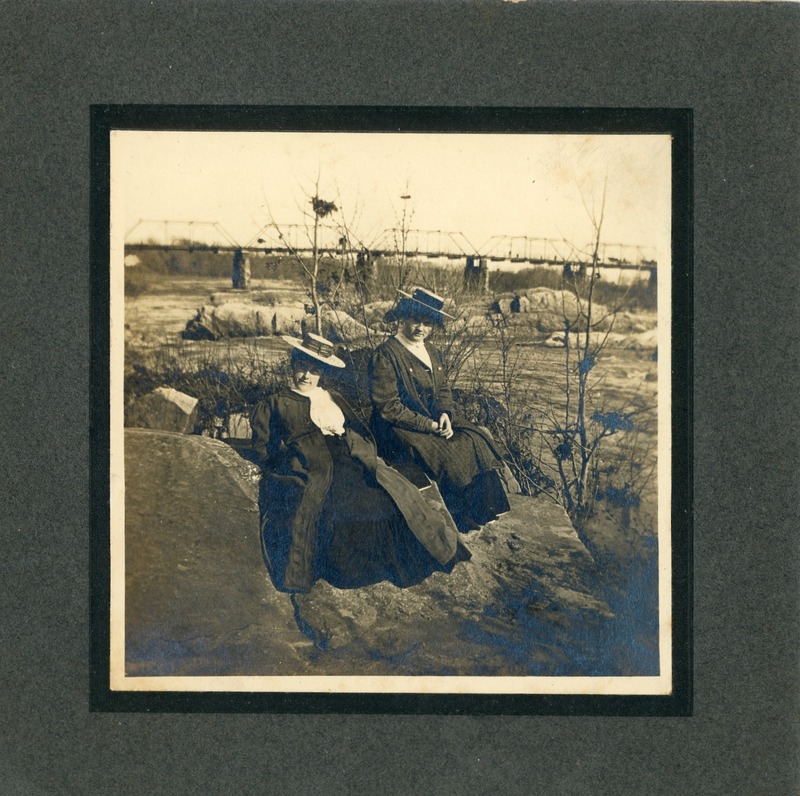 Undated photo of Ruth Sullivan and Margaret Maddox after the flood; Old Falmouth Bridge in the background.