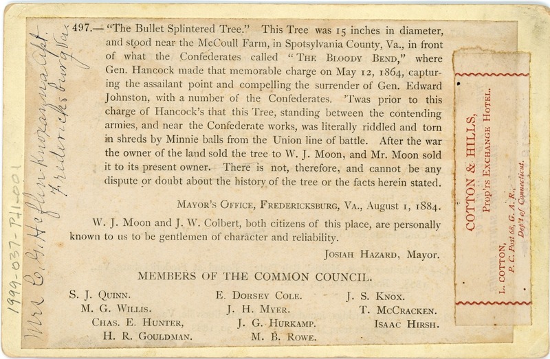 [on reverse] 497.--'The Bullet Splintered Tree." This Tree was 15 inches in diameter, and stood near the McCoull Farm, in Spotsylvania County, Va., in front of what the Confederates called "THE BLOODY BEND," where Gen. Hancock made that memorable charge on May 12, 1864, capturing the assailant point and compelling the surrender of Gen. Edward Johnston, with a number of the Confederates. 'Twas prior to this charge of Hancock's that this Tree, standing between the contending armies, and near the Confederate works, was literally riddled and torn in shreds of Minnie balls from the Union line of battle. After the war the owner of the land sold the tree to W.J. Moon, and Mr. Moon sold it to its present owner. There is not, therefore, and cannot be any dispute or doubt about the history of the tree or the facts herein stated.