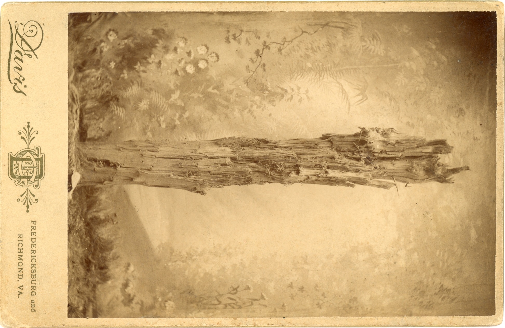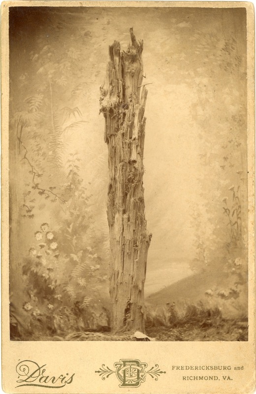Cabinet Card photo of Bullet Splintered Tree at McCoull's Farm, Spotsylvania with provenance on back supplied by the Mayor's office Fredericksburg and the common council, Aug. 1, 1884