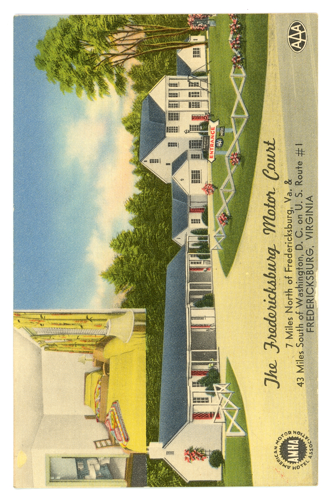 postcard with color images of Fredericksburg Motor Court exterior and room interior